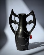 This gothically dramatic vessel is inspired by the ancient Greek lekythos form, reimagined during spooky season. It features bat wing/cathedral window-esque handles, adorned with draped chain and a single red glass drop. Handles and upper half of vase has been glazed in dark, drippy palladium. Measures 12m tall by 8cm wide.