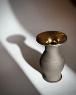 This stunning bellied vessel is inspired by the ancient Egyptians and their love of gold. This curvy vase has a wide flared rim which has been glazed in a rich gold, and has a raw stoneware exterior. Measures 8.5cm tall by 5.3cm wide.